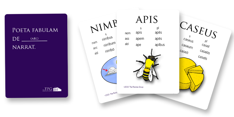 VERBA: Latin, English (for English Language Learners), Español (Spanish), and Français (French) are available now in the Web Store and if you can't wait, you can download the Print and Play file for all of the full core sets! You'll have to print out the cards and cut them out yourself and they won't be the same high quality production as the professional versions, but at least you'll get to use them right away! All core sets consist of 50 sentence cards and 145 noun cards and are designed for the novice language learner.