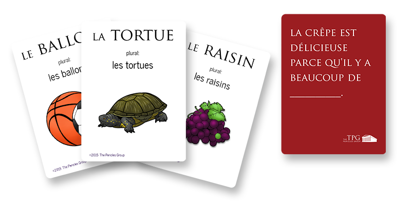 VERBA is the new language learning card game developed by The Pericles Group. The concept is incredibly simple -- one player (acting as a judge) draws a random card containing a fill in the blank sentence in the target language and the other players play a card containing a noun from their hand. The player who has played the sentence card then chooses the best card played and that player scores a point. Play continues with that player as the new judge.